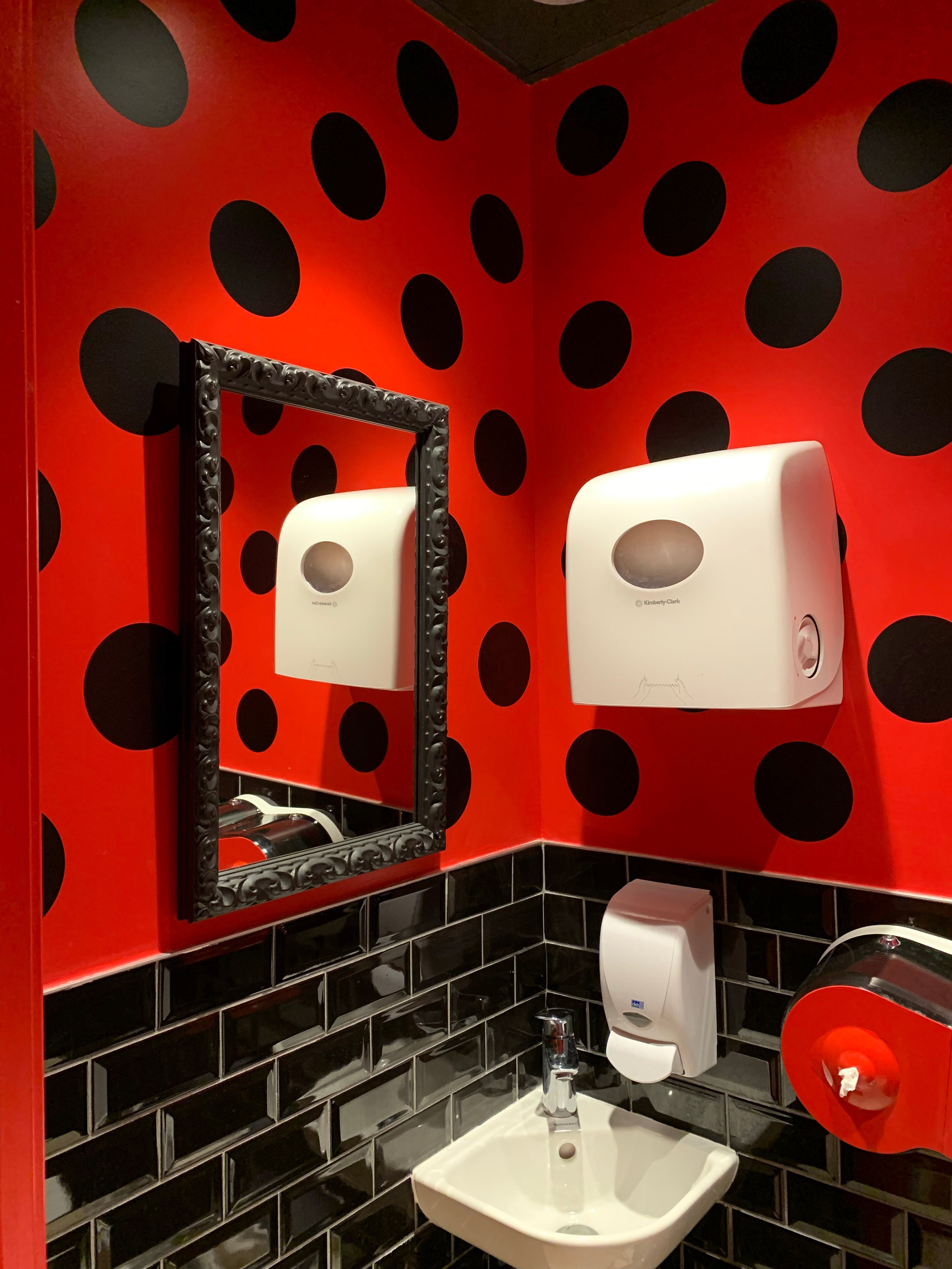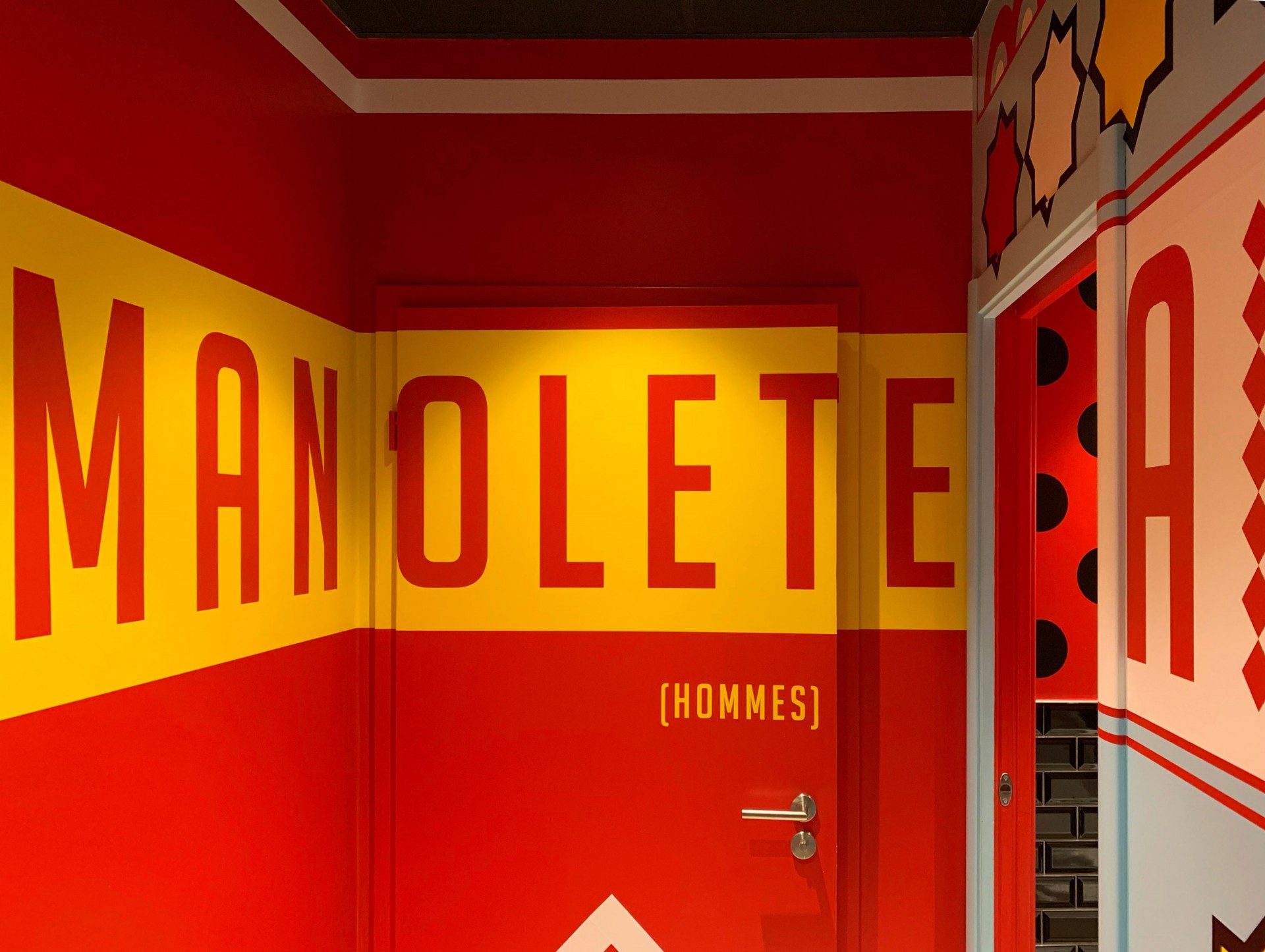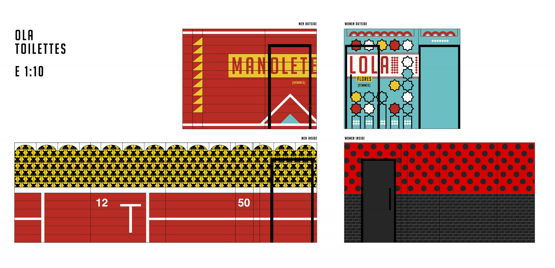 Durante nuestro proceso de análisis, interpretamos la propuesta gastronómica como una representación icónica de la cultura española en un contexto inmediato diferente caracterizado por otras costumbres y símbolos, lenguajes visuales y arquitectura. En contraste, nos propusimos representar un viaje por distintas zonas de España con sus diferentes representaciones urbanas y culturales. Si caminan desde el exterior hacia los servicios, los visitantes pueden experimentar un paseo que incluye Andalucía, Barcelona, Galicia, el flamenco, la plaza de toros, la pesca y otras historias típicas de ese hermoso país.
