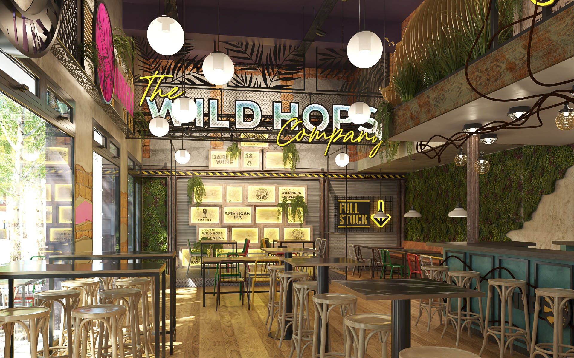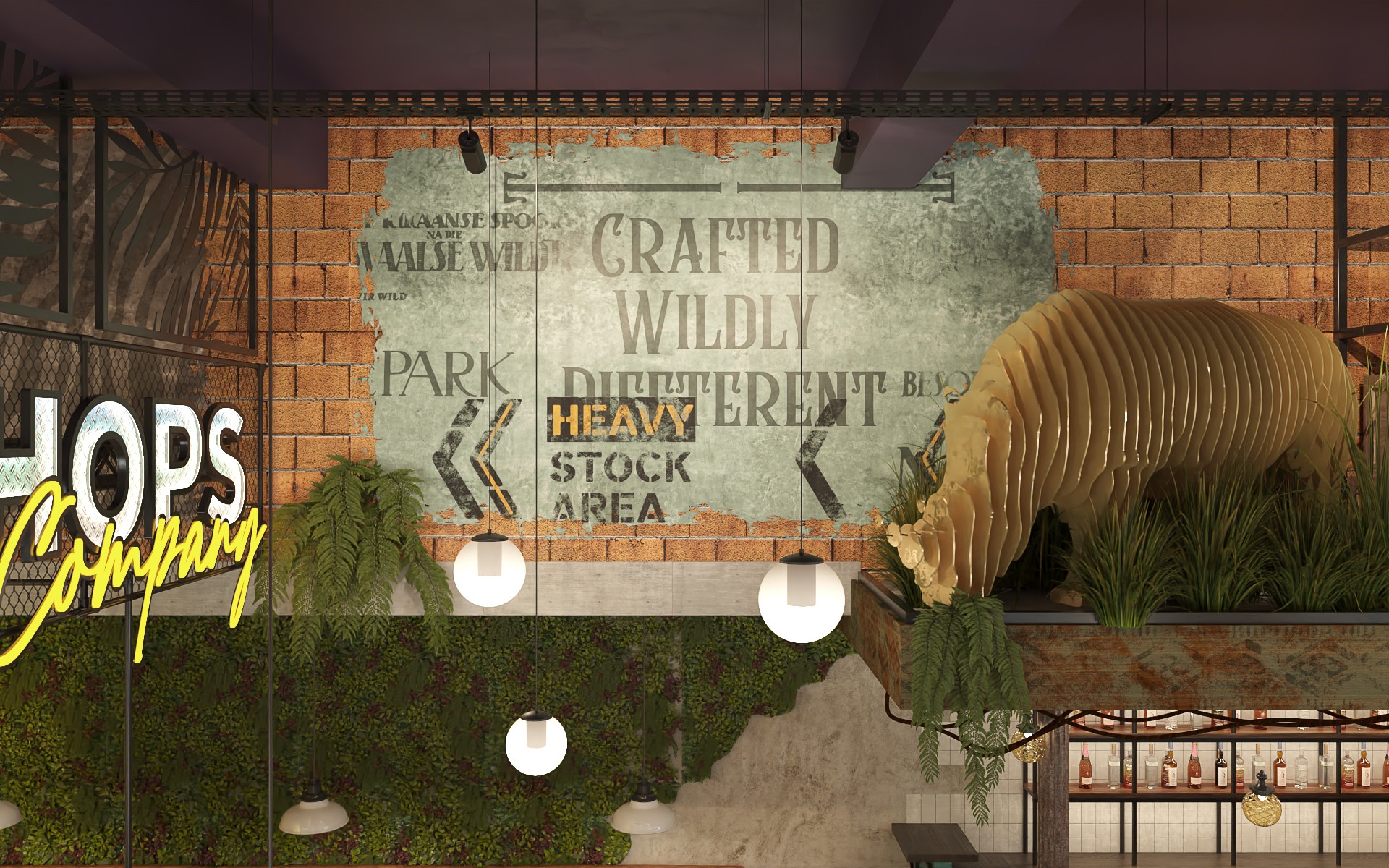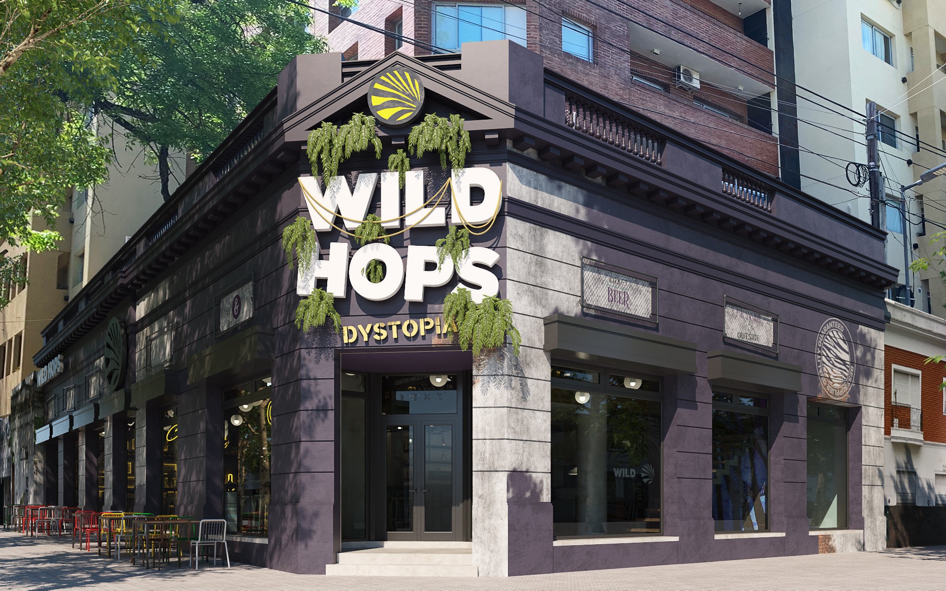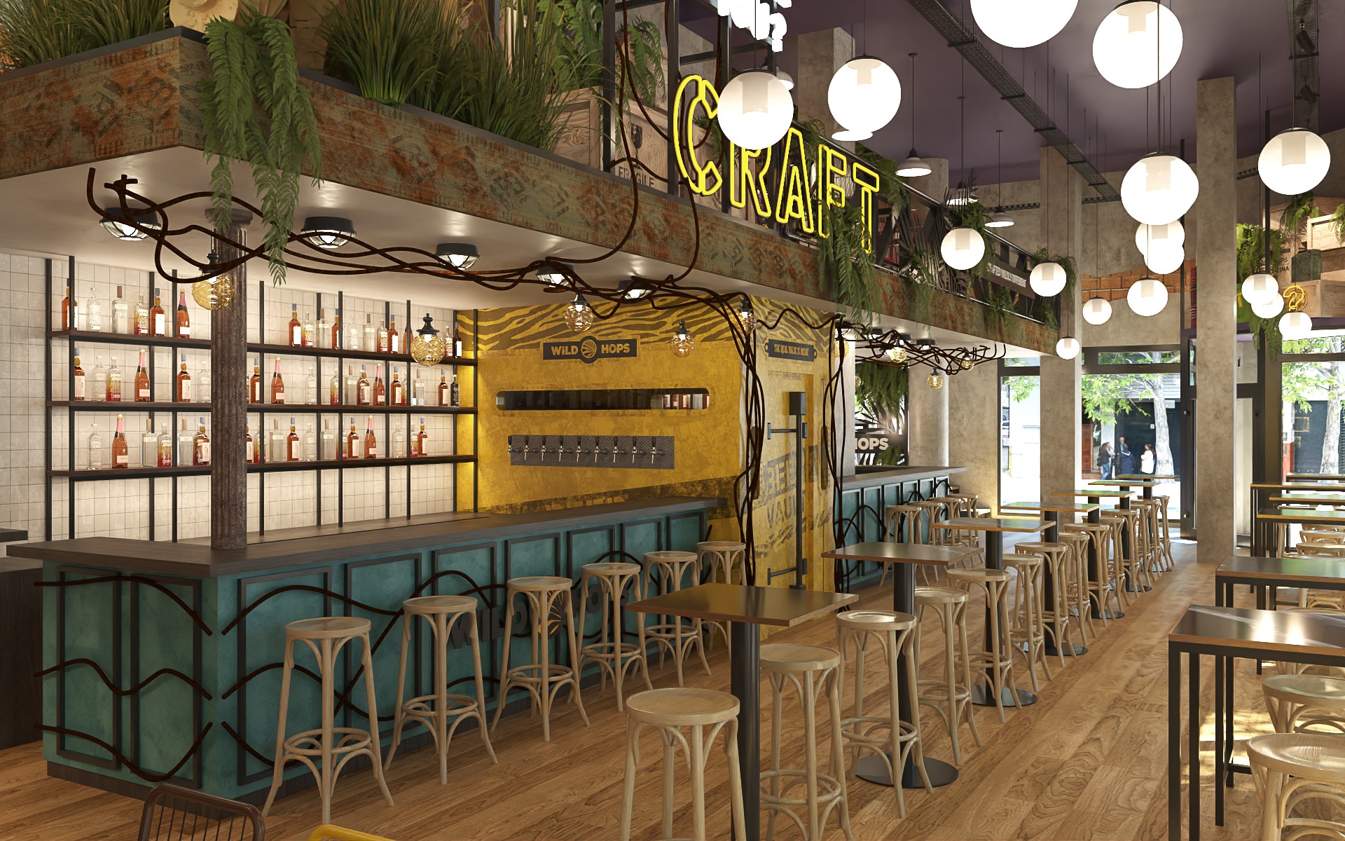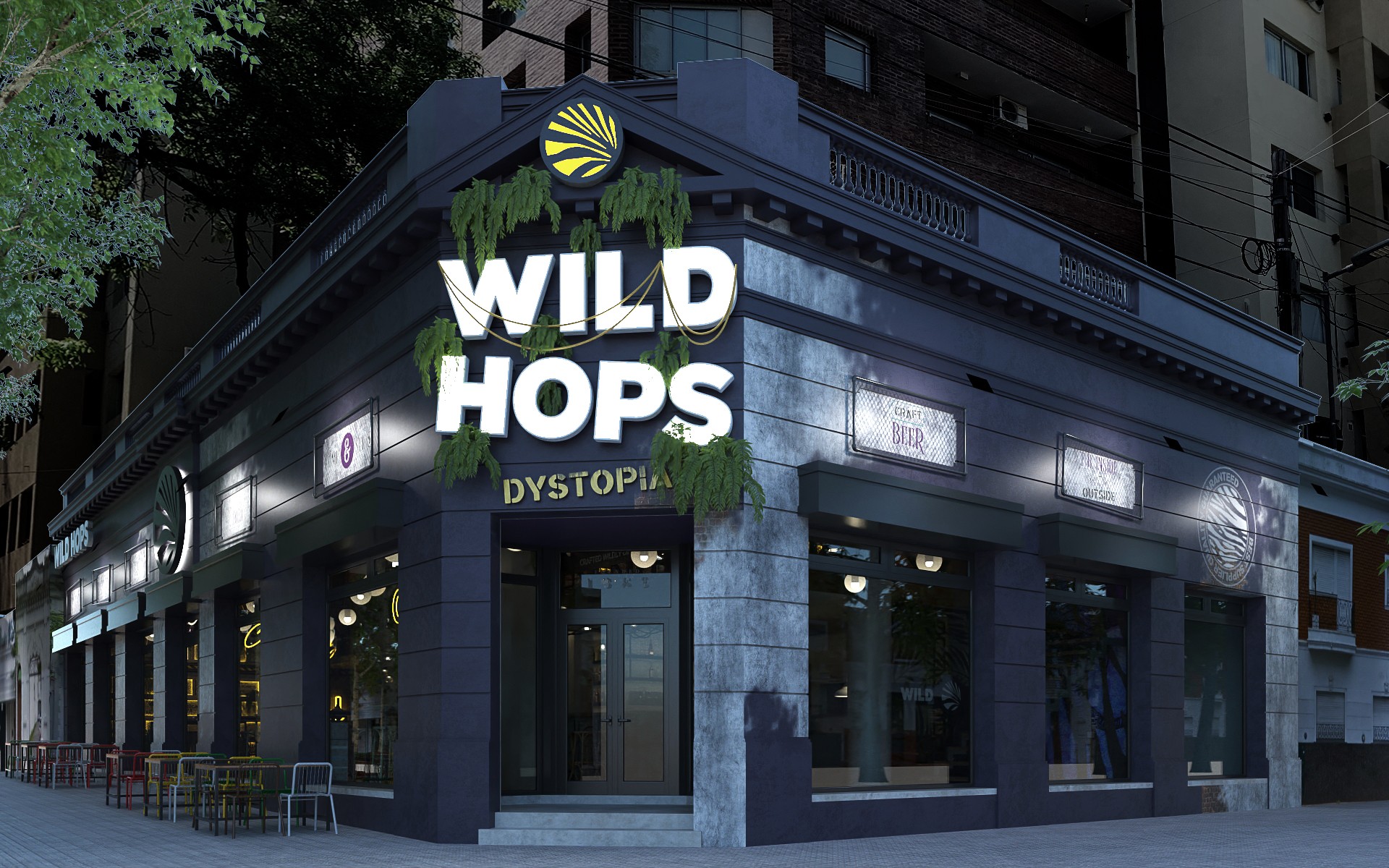 Wild Hops es una cadena de cervecerías ubicada en la ciudad de La Plata. En su versión original habíamos trabajado en la idea de irrupción de un colectivo humano en un contexto salvaje animal y vegetal. Para esta, su tercera sucursal, quisimos seguir indagando en la literatura de la marca, planteando un escenario distópico, algo post-apocalíptico, donde la vegetación y el mundo animal intentan recuperar espacios luego del avance de la sociedad de consumo.
