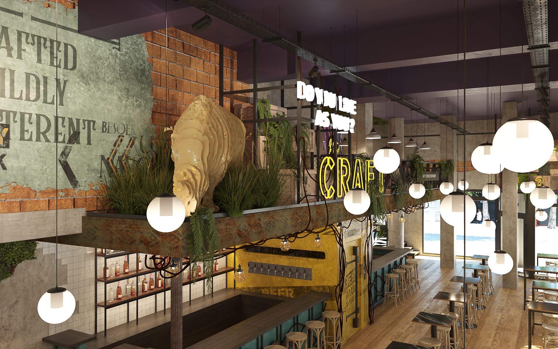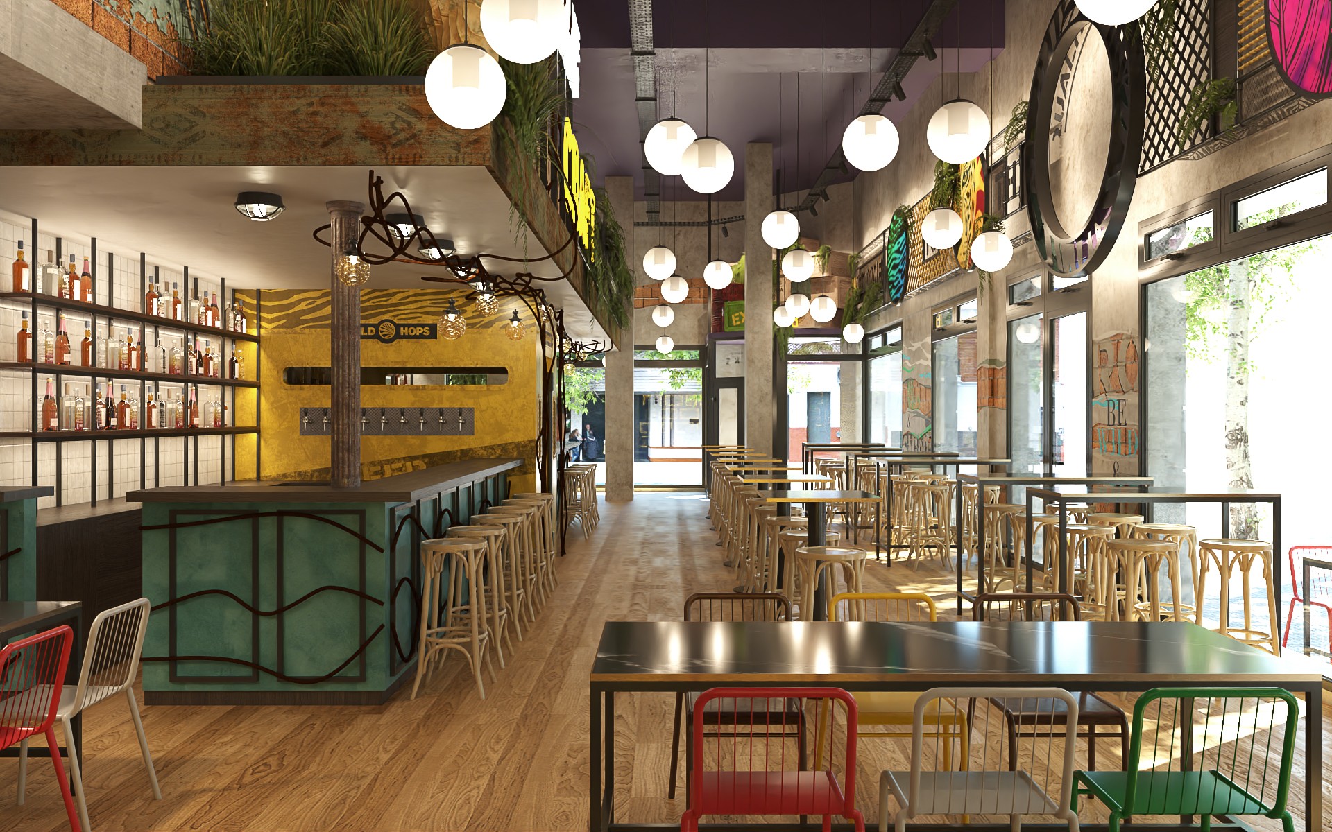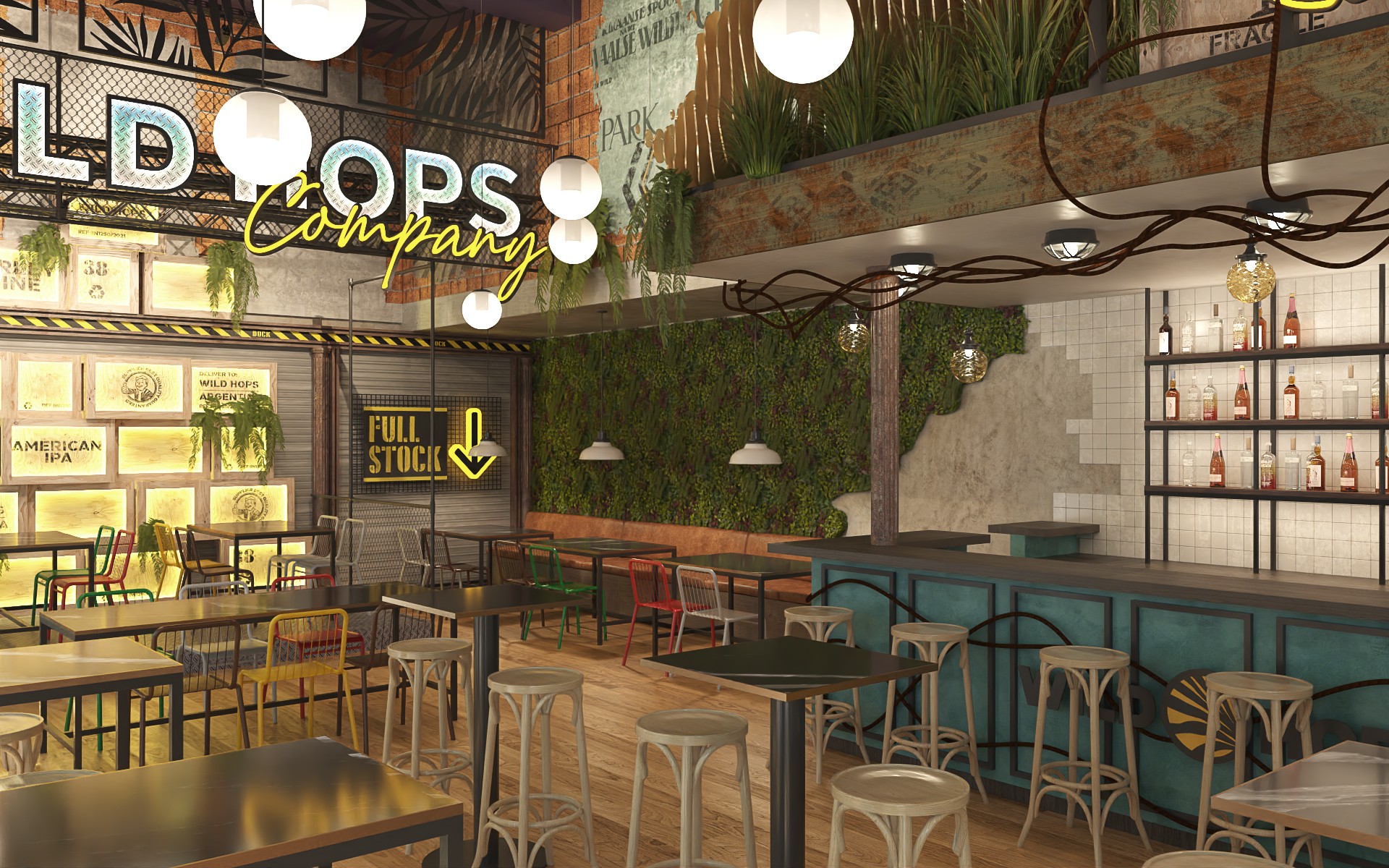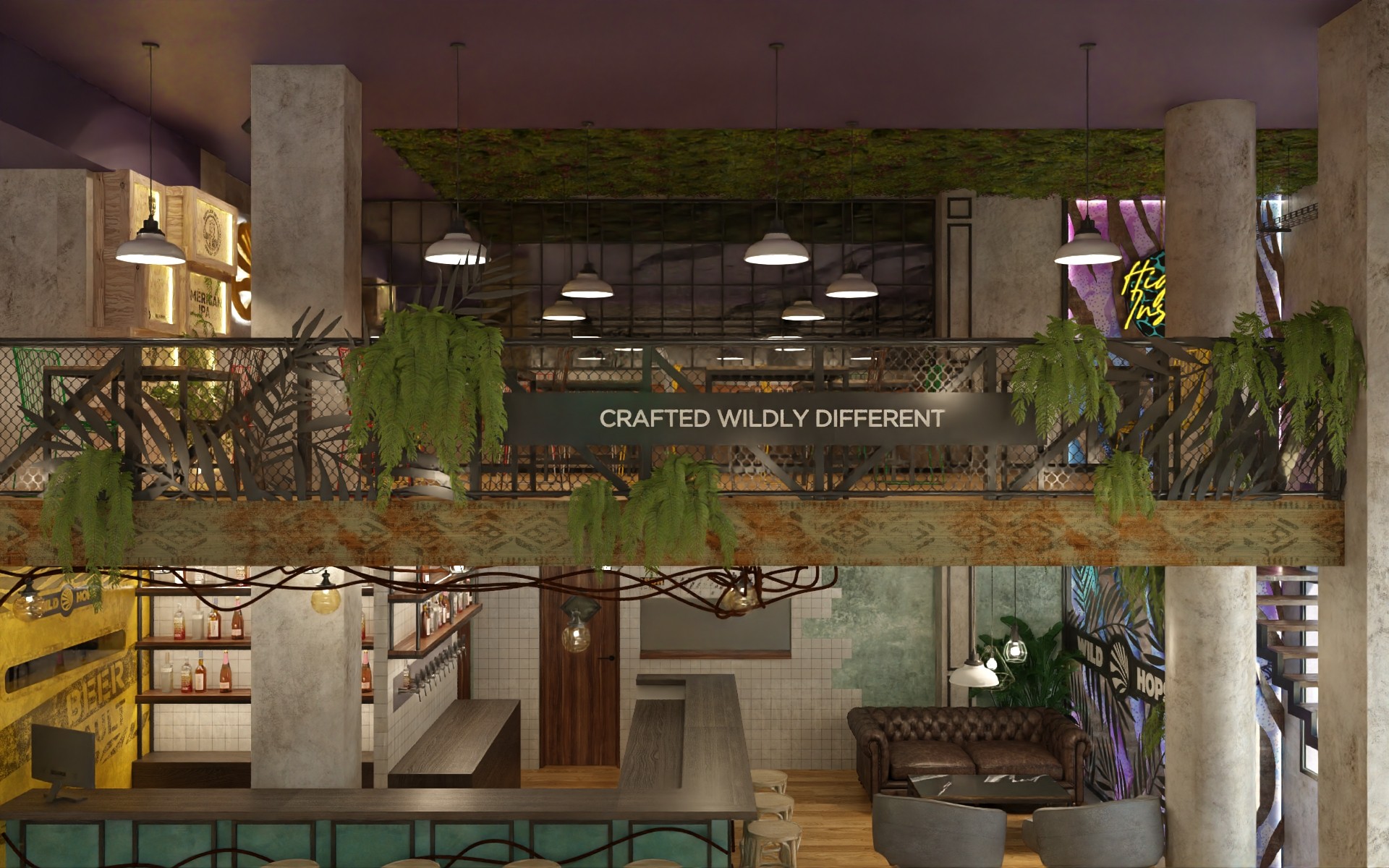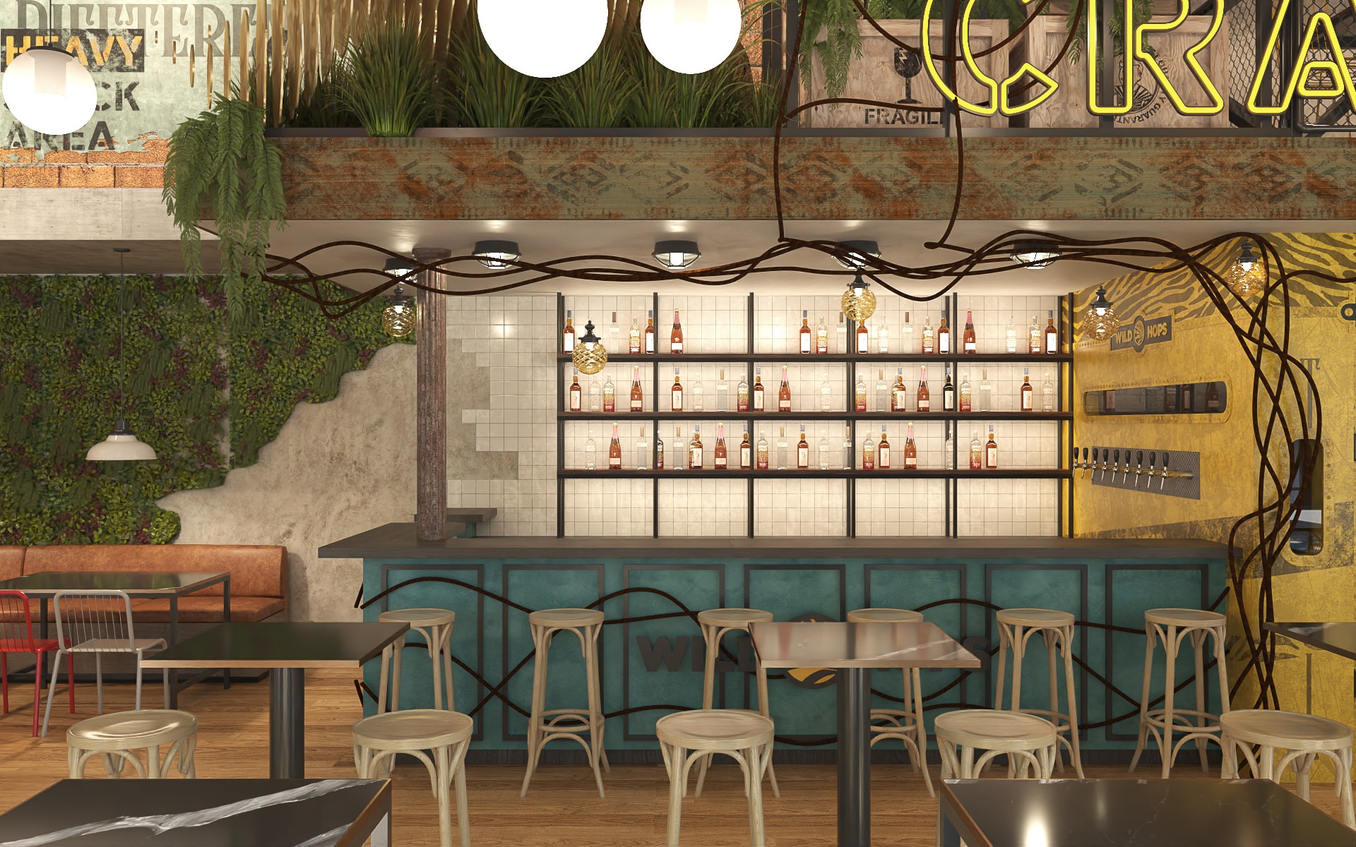 Wild Hops es una cadena de cervecerías ubicada en la ciudad de La Plata. En su versión original habíamos trabajado en la idea de irrupción de un colectivo humano en un contexto salvaje animal y vegetal. Para esta, su tercera sucursal, quisimos seguir indagando en la literatura de la marca, planteando un escenario distópico, algo post-apocalíptico, donde la vegetación y el mundo animal intentan recuperar espacios luego del avance de la sociedad de consumo.