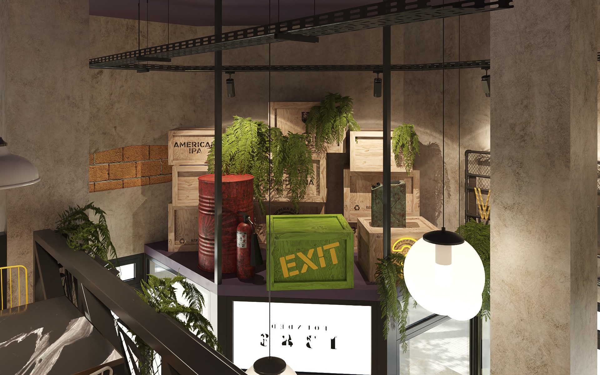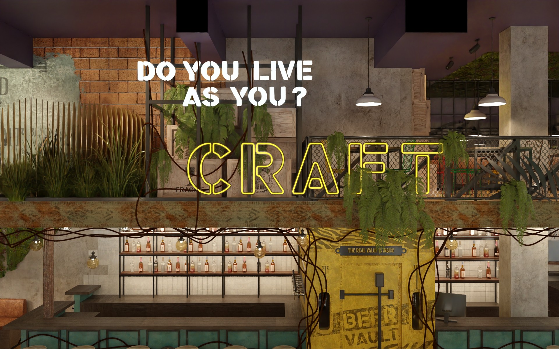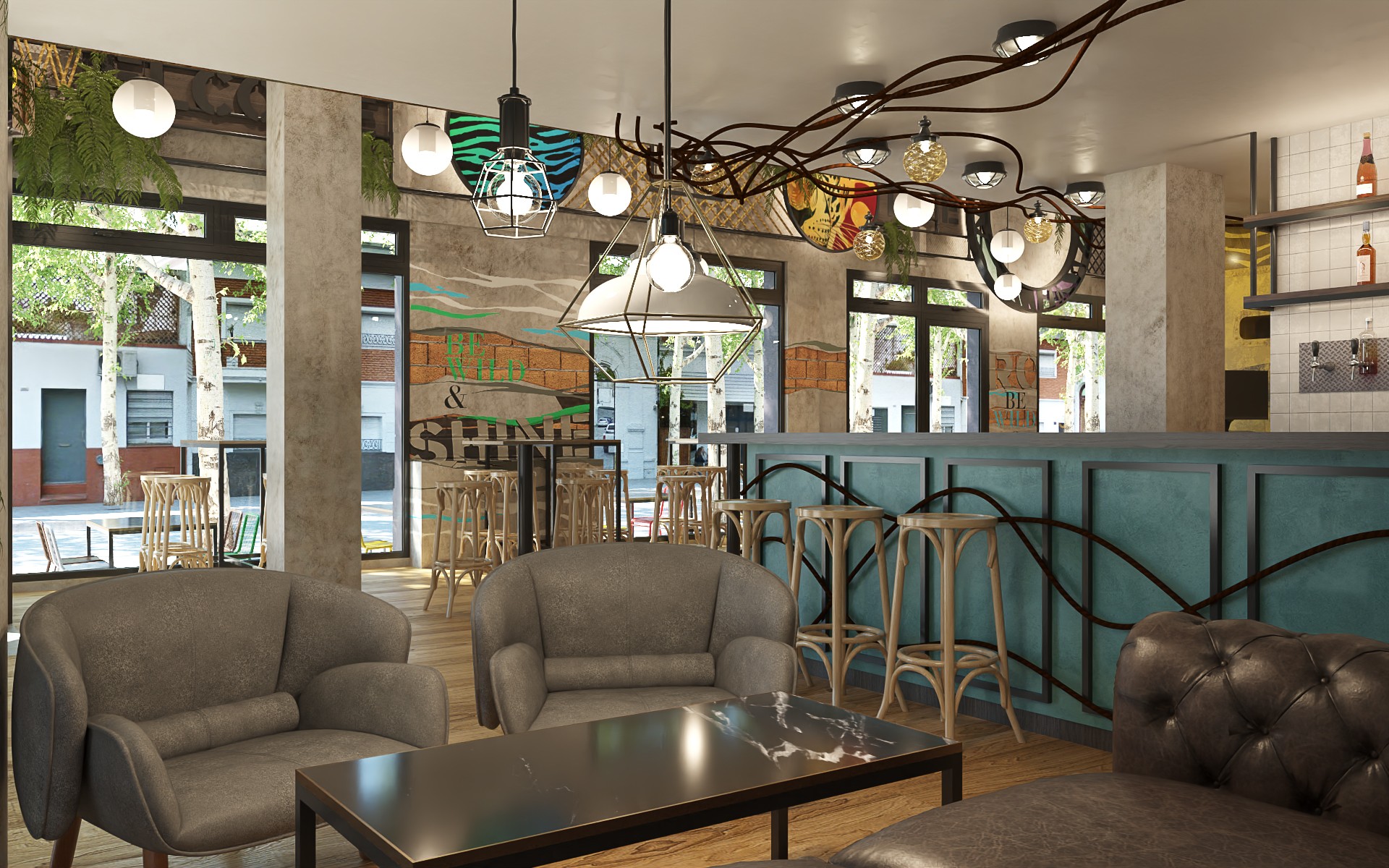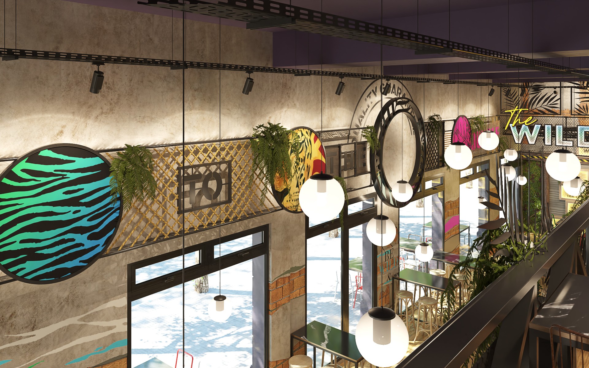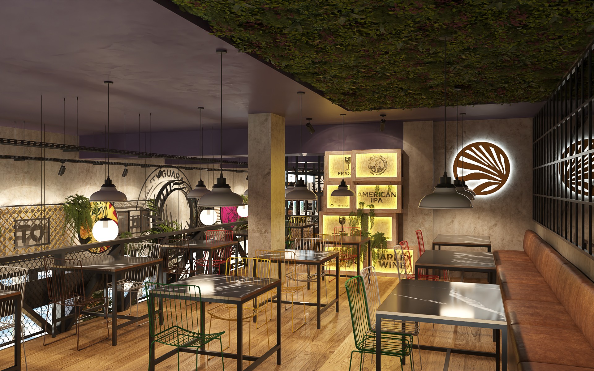 Wild Hops es una cadena de cervecerías ubicada en la ciudad de La Plata. En su versión original habíamos trabajado en la idea de irrupción de un colectivo humano en un contexto salvaje animal y vegetal. Para esta, su tercera sucursal, quisimos seguir indagando en la literatura de la marca, planteando un escenario distópico, algo post-apocalíptico, donde la vegetación y el mundo animal intentan recuperar espacios luego del avance de la sociedad de consumo.